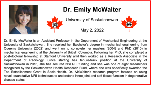 Join @JackieZehr and Franzi Onasch on Monday the 2nd of May 2022 for another Episode 12 of the CSB-SCB Podcast! In this episode, they have an exciting discussion with Dr. Emily McWalter (University of Saskatchewan) about her research on the use of MRI for the study of knee joint and soft tissue function in disease states. Dr. McWalter also explains the development of novel quantitative MRI techniques to study tendons and ligaments in the knee.